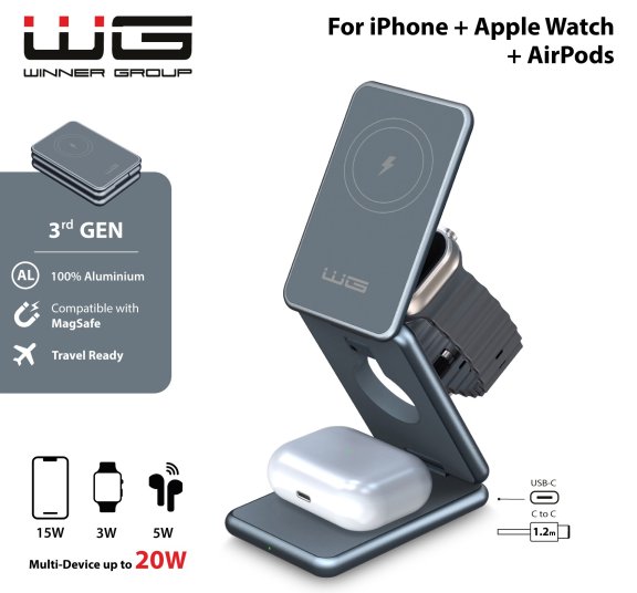 Bezdrátová nabíječka WG Tower of Charge je skládací magnetická nabíječka 3v1 kompatibilní s Magsafe. Nabíjejte tři zařízení současně s elegantní a odolnou hliníkovou konstrukcí, kterou si můžete vzít kamkoli.