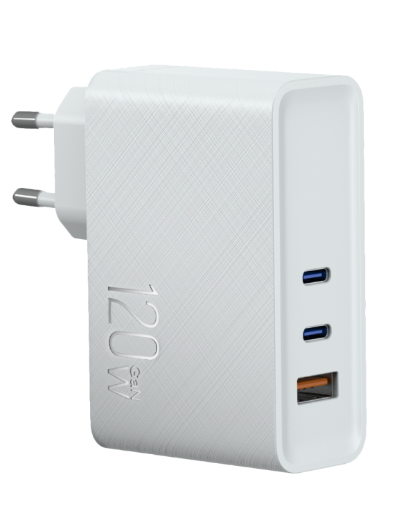 Síťová nabíječka s maximálním výkonem 120 W dokáže nabíjet až 3 zařízení současně včetně notebooků. Nabíječka má 1 výstup USB-A a 2 výstupy USB-C. Výstup USB-A podporuje rychlo-nabíjení 3.0 a 4+. Výstupy USB-C podporuje rychlo-nabíjení GaN PD 3.0 i PPS s výkonem až 100 W.