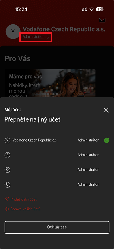 Když u svého přihlašovacího e-mailu máte přidělený přístup také ke službám jiného zákazníka (resp. z jiného zákaznického účtu), můžete se mezi nimi jednoduše přepínat: