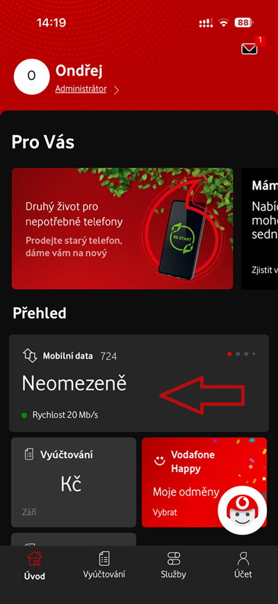 Po výběru se vám hlavní stránka samoobsluhy načte znovu a uvidíte informace k vámi vybrané službě. Hodit se vám to může například pro vyzvednutí datového dárku, zapnutí Zrychlení na maximum nebo aktivaci neomezených dat v případě výpadku internetu.