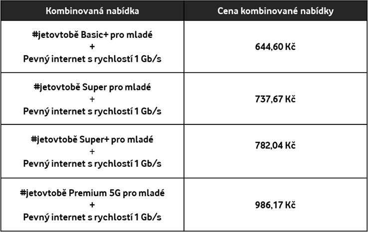 Nabídku „Kombinovaná nabídka tarif #jetovtobě pro mladé a pevný internet s rychlostí připojení 1 Gb/s“ (dále jen “Nabídka“) jsme připravili pro nefiremní zákazníky (fyzické osoby), kteří si nově pořídí obě služby v kombinované nabídce ve složení mobilní tarif #jetovtobě pro mladé + pevný internet s rychlostí 1 Gb/s.